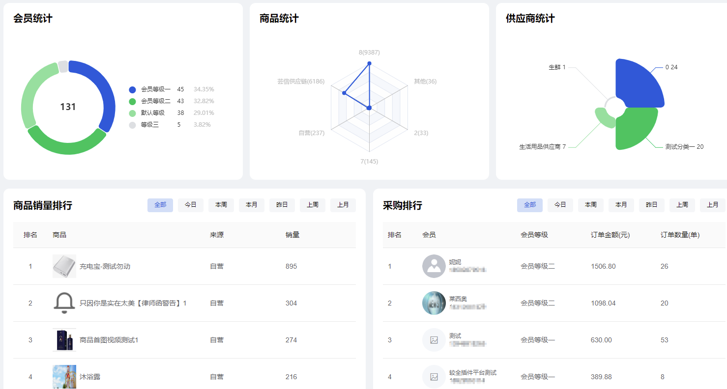 2、展示会员统计(根据会员等级数量统计),商品统计,供应商统计信息,商品销量排行和采购排行(可筛选今日,本周,本月,昨日,上周,上月)数据