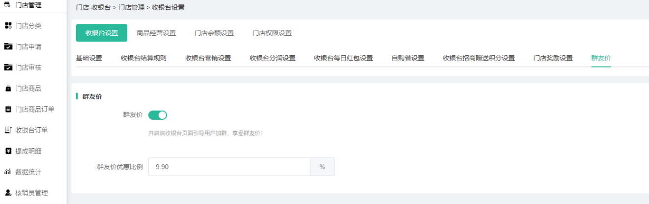 群友价优惠比例:只有门店商品群友价是单门店独立判断才是使用该设置的比例